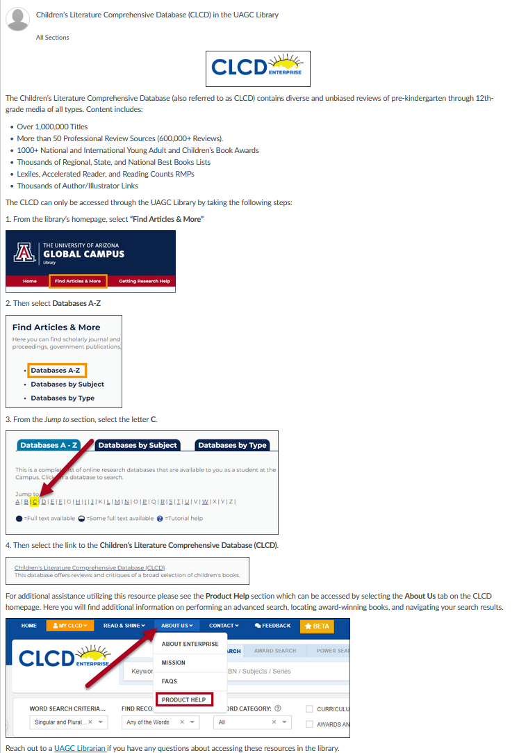 <p><img style="display: block; margin-left: auto; margin-right: auto;" src="https://ashford.instructure.com/users/143106/files/20580506/preview?verifier=Bz1oMBcBltHNClFMDMnLWGgnDD4yZ4BoeyUBEDje" alt="CLCD-1.png" data-api-endpoint="https://ashford.instructure.com/api/v1/users/143106/files/20580506" data-api-returntype="File" /></p> <p>The Children’s Literature Comprehensive Database (also referred to as CLCD) contains diverse and unbiased reviews of pre-kindergarten through 12th-grade media of all types. Content includes:</p> <ul> <li>Over 1,000,000 Titles</li> <li>More than 50 Professional Review Sources (600,000+ Reviews).</li> <li>1000+ National and International Young Adult and Children’s Book Awards</li> <li>Thousands of Regional, State, and National Best Books Lists</li> <li>Lexiles, Accelerated Reader, and Reading Counts RMPs</li> <li>Thousands of Author/Illustrator Links</li> </ul> <p>The CLCD can only be accessed through the UAGC Library by taking the following steps:</p> <p>1. From the library’s homepage, select <strong>“Find Articles & More”</strong></p> <p><strong><img src="https://ashford.instructure.com/users/143106/files/20580719/preview?verifier=EF21O3auYCNh7XgEGIMGyKVTeM00yeqSCt3zs3Mv" alt="Find Articles & More-1.jpg" data-api-endpoint="https://ashford.instructure.com/api/v1/users/143106/files/20580719" data-api-returntype="File" /></strong></p> <p>2. Then select <strong>Databases A-Z</strong></p> <p><strong><img src="https://ashford.instructure.com/users/143106/files/20580735/preview?verifier=5NUAqyDAKhDz7wrxB1G2rXvvPUry0pTBZItBl64r" alt="Databases A-Z-1.png" data-api-endpoint="https://ashford.instructure.com/api/v1/users/143106/files/20580735" data-api-returntype="File" /></strong></p> <p>3. From the <em>Jump to </em>section, select the letter <strong>C</strong>.</p> <p><img src="https://ashford.instructure.com/users/143106/files/20580737/preview?verifier=WX7g9HhoYG08N94itdygrGMZVwWwaKF5MelEr2v5" alt="Databases Jump to C.png" data-api-endpoint="https://ashford.instructure.com/api/v1/users/143106/files/20580737" data-api-returntype="File" /></p> <p>4. Then select the link to the <strong>Children’s Literature Comprehensive Database (CLCD)</strong>.</p> <p><img src="https://ashford.instructure.com/users/143106/files/20580739/preview?verifier=ZtenYpghLS0FxCYIZnJPs21hAwN6WE45egLhBhbM" alt="Childrens Literature Database CLCD.png" data-api-endpoint="https://ashford.instructure.com/api/v1/users/143106/files/20580739" data-api-returntype="File" /></p> <p>For additional assistance utilizing this resource please see the <strong>Product Help </strong>section which can be accessed by selecting the <strong>About Us </strong>tab on the CLCD homepage. Here you will find additional information on performing an advanced search, locating award-winning books, and navigating your search results.</p> <p><img src="https://ashford.instructure.com/users/143106/files/20580749/preview?verifier=OMhmqaYuRncOvdxnVqg5NdgijKZehBp7Savwbnl9" alt="CLCD Product Help.png" data-api-endpoint="https://ashford.instructure.com/api/v1/users/143106/files/20580749" data-api-returntype="File" /></p> <p>Reach out to a <a href="mailto:library@uagc.edu">UAGC Librarian </a>if you have any questions about accessing these resources in the library.</p>