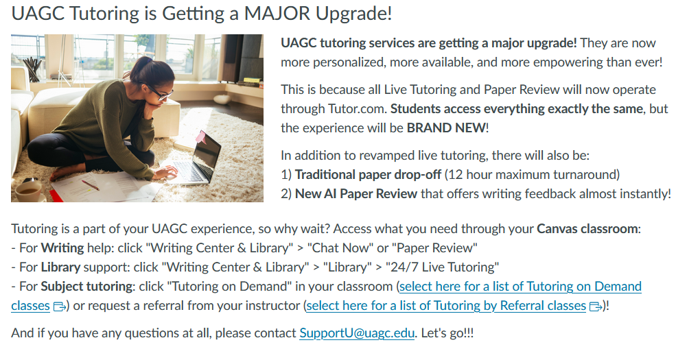 <p><img style="float: left; margin: 0 25px 25px 0;" src="https://uagc.instructure.com/users/187097/files/23938722/preview?verifier=QVCtDS4sZZjlCHA1j73kAhHSvWmbV9e4oxrAZI3B" alt="iStock-621861380.jpg" width="368" height="246" data-api-endpoint="https://uagc.instructure.com/api/v1/users/187097/files/23938722" data-api-returntype="File" /></p> <p style="margin-top: 0;"><span style="font-size: 14pt;"><strong>UAGC tutoring services are getting a major upgrade!</strong> They are now more personalized, more available, and more empowering than ever!</span></p> <p><span style="font-size: 14pt;">This is because all Live Tutoring and Paper Review will now operate through Tutor.com. <strong>Students access everything exactly the same</strong>, but the experience will be <strong>BRAND NEW</strong>!</span></p> <p><span style="font-size: 14pt;">In addition to revamped live tutoring, there will also be:</span><br /><span style="font-size: 14pt;">1) <strong>Traditional paper drop-off</strong> (12 hour maximum turnaround)</span><br /><span style="font-size: 14pt;">2) <strong>New AI Paper Review</strong> that offers writing feedback almost instantly!</span></p> <p style="clear: left; margin-top: 0;"><span style="font-size: 14pt;">Tutoring is a part of your UAGC experience, so why wait? Access what you need through your <strong>Canvas classroom</strong>:</span><br /><span style="font-size: 14pt;">- For <strong>Writing </strong>help: click "Writing Center & Library" > "Chat Now" or "Paper Review"</span><br /><span style="font-size: 14pt;">- For <strong>Library </strong>support: click "Writing Center & Library" > "Library" > "24/7 Live Tutoring"</span><br /><span style="font-size: 14pt;">- For <strong>Subject tutoring</strong>: click "Tutoring on Demand" in your classroom (<a class="inline_disabled" href="https://equella.uagc.edu/curriculum/file/9afb28af-1660-4606-83ee-0cbc06879a4e/1/All_Courses_With_Tutoring_On_Demand_Course_Links.pdf" target="_blank" rel="noopener">select here for a list of Tutoring on Demand classes</a>) or request a referral from your instructor (<a class="inline_disabled" href="https://equella.uagc.edu/curriculum/file/8cd21b91-057f-4d2f-91c9-813a9fc0336d/1/Tutoring_Resources_in_Courses.pdf" target="_blank" rel="noopener">select here for a list of Tutoring by Referral classes</a>)!</span></p> <p><span style="font-size: 14pt;">And if you have any questions at all, please contact <a href="mailto:SupportU@uagc.edu" target="_blank" rel="noopener">SupportU@uagc.edu</a>. Let's go!!!</span></p>