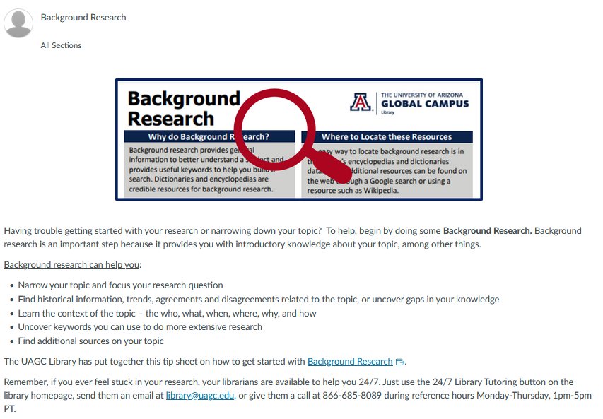 <p><a class="inline_disabled" href="https://equella.uagc.edu/curriculum/file/a2f48509-b6ae-4812-87e3-46da34fd048e/1/Background%20Research.pdf" target="_blank" rel="noopener"><img style="display: block; margin-left: auto; margin-right: auto;" src="https://ashford.instructure.com/users/126656/files/17611403/preview?verifier=M0IAI3gGmXzTXO5j7Bu3JHAQHChHHLcHkU9l342V" alt="A preview of the UAGC Library Background Research tip sheet with a red magnifying glass on top." width="650" height="276" data-api-endpoint="https://ashford.instructure.com/api/v1/users/126656/files/17611403" data-api-returntype="File" /></a></p> <p>Having trouble getting started with your research or narrowing down your topic? To help, begin by doing some <strong>Background Research.</strong> Background research is an important step because it provides you with introductory knowledge about your topic, among other things.</p> <p><u>Background research can help you</u>:</p> <ul> <li>Narrow your topic and focus your research question</li> <li>Find historical information, trends, agreements and disagreements related to the topic, or uncover gaps in your knowledge</li> <li>Learn the context of the topic – the who, what, when, where, why, and how</li> <li>Uncover keywords you can use to do more extensive research</li> <li>Find additional sources on your topic</li> </ul> <p>The UAGC Library has put together this tip sheet on how to get started with <a class="inline_disabled" href="https://equella.uagc.edu/curriculum/file/a2f48509-b6ae-4812-87e3-46da34fd048e/1/Background%20Research.pdf" target="_blank" rel="noopener">Background Research</a>. </p> <p>Remember, if you ever feel stuck in your research, your librarians are available to help you 24/7. Just use the 24/7 Library Tutoring button on the library homepage, send them an email at <a href="mailto:library@uagc.edu," target="_blank" rel="noopener">library@uagc.edu,</a> or give them a call at 866-685-8089 during reference hours Monday-Thursday, 1pm-5pm PT.</p>