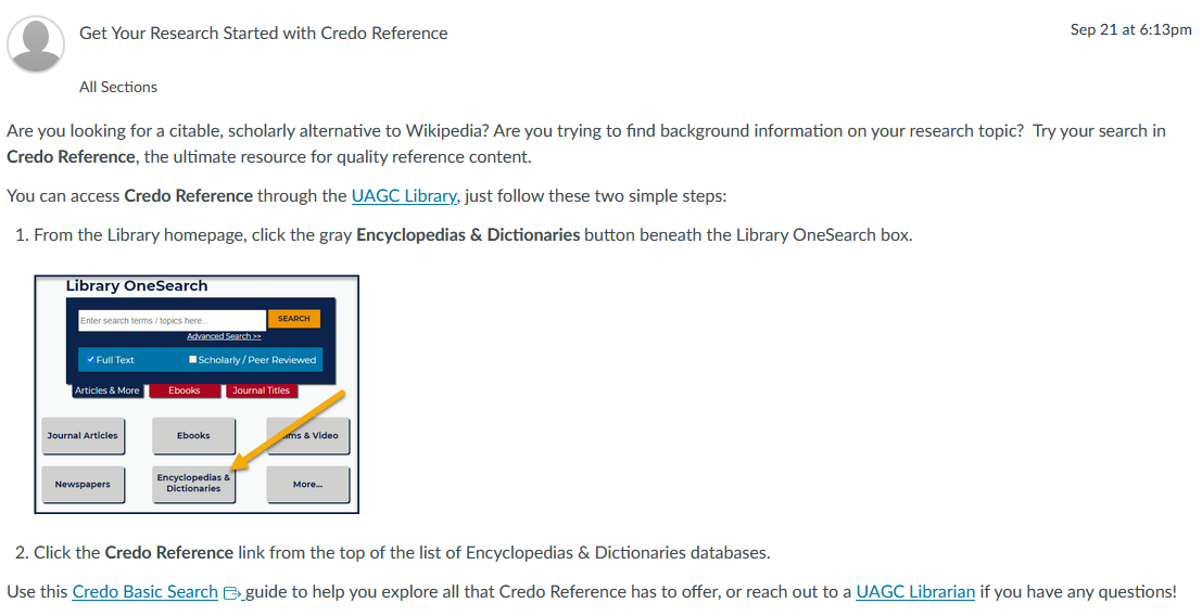 Use the announcement below to highlight Credo Reference for your students, a citable academic alternative to Wikipedia. Credo Reference is a database in the UAGC Library that includes hundreds of reference eBooks such as subject specific encyclopedias, handbooks, guides, and over 400,000 images.